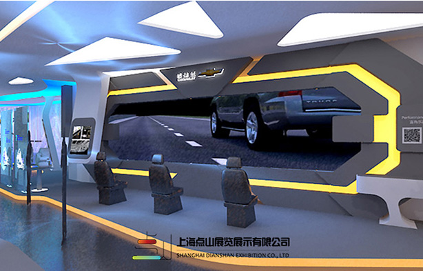 在展廳設(shè)計中,點(diǎn)山展示將雪佛蘭汽車展廳主要分為館名墻、品牌介紹、發(fā)展歷程、創(chuàng)新產(chǎn)品、展望未來五個展區(qū),運(yùn)用流暢的線條貫穿整個展館,展館主色調(diào)為藍(lán)色、讓展館科技感十足。
