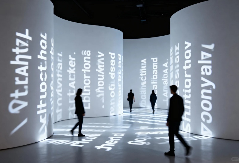 4. 空間化:構建文字的三維迷宮,文字作為隔斷或結構,用大型立體字構成空間的分隔墻、通道或頂棚,文字本身成為建筑元素。 沉浸式文字場域:打造一個被文字完全包裹的空間,如: “文字雨”:天花板不斷“落下”緩緩飄動的文字。 “文字森林”:無數(shù)懸掛的透明亞克的優(yōu)點上印有文字,隨風輕擺。 “回音壁”:弧形墻面刻滿文字,同時具有聲學反射效果,低語可被清晰聽到。