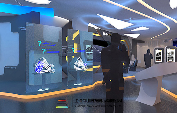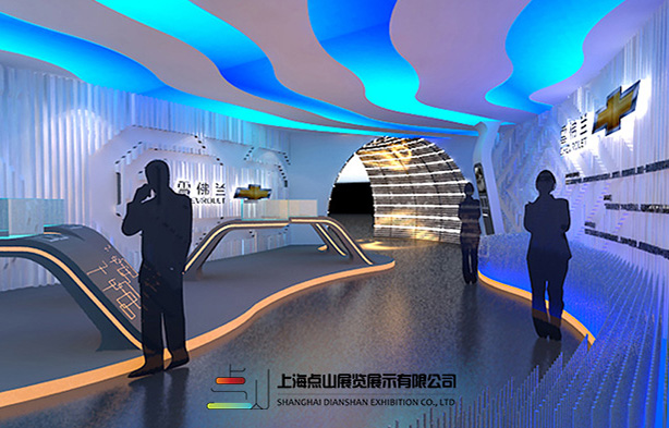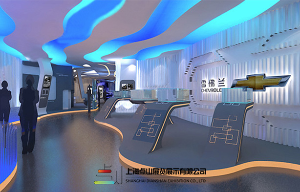 在展廳設(shè)計中,點(diǎn)山展示將雪佛蘭汽車展廳主要分為館名墻、品牌介紹、發(fā)展歷程、創(chuàng)新產(chǎn)品、展望未來五個展區(qū),運(yùn)用流暢的線條貫穿整個展館,展館主色調(diào)為藍(lán)色、讓展館科技感十足。