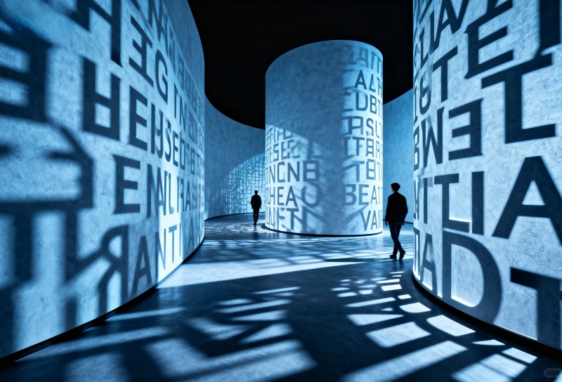 4. 空間化:構建文字的三維迷宮,文字作為隔斷或結構,用大型立體字構成空間的分隔墻、通道或頂棚,文字本身成為建筑元素。 沉浸式文字場域:打造一個被文字完全包裹的空間,如: “文字雨”:天花板不斷“落下”緩緩飄動的文字。 “文字森林”:無數(shù)懸掛的透明亞克的優(yōu)點上印有文字,隨風輕擺。 “回音壁”:弧形墻面刻滿文字,同時具有聲學反射效果,低語可被清晰聽到。